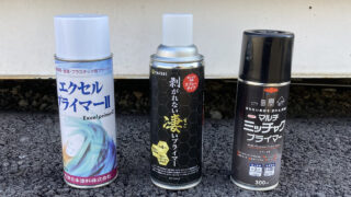 刷毛や容器を用意せず手軽に使えるスプレータイプのプライマー3種をいろいろな素材、クリアファイル、ゴム、塩ビパイプ、シリコーンコーキング、アルミ、木材、プラべニアで密着テストして比較してみました。